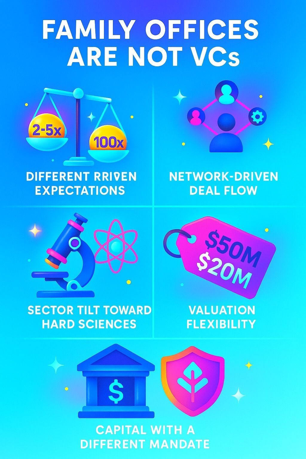 Venture funds underwrite every investment with the potential to return the fund many times over. Family offices, managing hundreds of millions or billions, are often satisfied with a 2 to 5x multiple, sometimes 10x. At their scale, the difference between a 20 million entry valuation and a 50 million entry valuation is barely material.